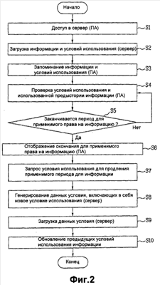 Пользовательская аппаратура принимает данные нового условия из сервера и обновляет предыдущие условия использования для соответствующей информации с использованием принятых данных условия (этап 10). Условия использования для права использования информации могут включать в себя, по меньшей мере, одно из следующего: крайний срок информации (т. е. период окончания права использования информации), применимый отсчет информации, применимый период информации, применимое интегральное время информации, диапазон применимого пользователя информации и диапазон применимой пользовательской аппаратуры информации.