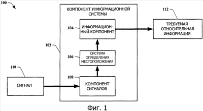 На Фиг.1 показана блок-схема информационной системы 100 в соответствии с аспектом настоящего изобретения. Информационная система 100 состоит из компонента 102 информационной системы, содержащего информационный компонент 104, системы 106 определения местоположения и компонента 108 сигналов. Сигнал 110 принимают посредством компонента 108 сигналов и обрабатывают (преобразуют) в индикатор уровня сигнала. Такая обработка обычно требует аналого-цифрового преобразования. Компонент 108 сигналов может быть способным к обработке различных сигналов, таких как внешние радиосигналы и т.п., включая, но не ограниваясь таковыми: сигналы с частотной модуляцией (ЧМ, FM). Как только сигнал преобразован в индикатор сигнала, его передают на систему 106 определения местоположения. Система 106 определения местоположения обрабатывает индикаторы сигнала и подает местоположение (данные) на информационный компонент 104. Информационный компонент 104 использует эти данные местоположения, чтобы сформировать набор релевантных данных. Релевантность данных может быть строго основана на местоположении и/или комбинации местоположения и предпочтений пользователя (посредством входных данных пользователя, не показаны). Данные могут также быть связаны с информацией из загружаемых справочных таблиц, которые способствуют обработке. Как только данные выбраны, их поставляют пользователю в качестве “требуемой относительной информации” 112 посредством пользовательского интерфейса, например графического пользовательского интерфейса (ГПИ, GUI) и/или пользовательского интерфейса на основе текста и подобного.
