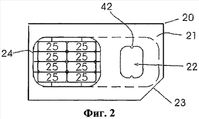 Когда первая карта 20 с чипом ИС контактирует с контактными штырьками переносного устройства связи, первая карта 20 с чипом ИС может иметь доступ к информации, хранящейся в первой карте 20 с чипом ИС. Кроме того, первая карта 20 с чипом ИС имеет отверстие 22, предназначенное для размещения второго чипа ИС 34, расположенного на второй подложке 37. В первом варианте осуществления имеются несколько выступов 42, выполненных по краям отверстия 22 и предназначенных для удерживания второго чипа ИС 34. Кроме того, выступы 42 выполнены (но не ограниваются этим) на верхнем и нижнем краях отверстия 22. Кроме того, их можно было бы выполнить и на левом и правом краях отверстия 22. Первый чип ИС 24 имеет восемь контактов 25, но восемью количество контактов не ограничивается.