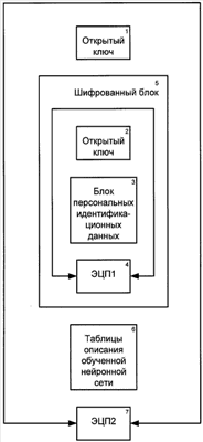 7 – вторая электронная цифровая подпись (ЭЦП2) органа, выдающего удостоверение, охватывающая все содержимое удостоверения: открытый ключ пользователя 1, таблицы описания обученной нейросети, шифрованный блок 5, состоящий из зашифрованных открытого ключа пользователя 2, блока идентификационных данных 3, первой электронно-цифровой подписи 4.