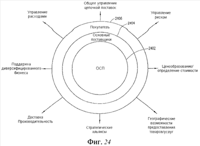Фиг.24 иллюстрирует, каким образом варианты осуществления изобретения могут воздействовать на цепочку поставок покупателя. Фиг.24 включает в себя область 2402 деятельности ОСП, область 2404 деятельности основного поставщика и область 2406 деятельности покупателя в виде концентрических кругов, причем область 2406 деятельности ОСП находится в центре. Различные варианты осуществления изобретения позволяют покупателю оценивать данные не только в области 2406 деятельности покупателя и в области 2404 деятельности основного поставщика, но также в области 2402 деятельности ОСП. Информация, полученная таким образом от покупателя, может использоваться для улучшения различных аспектов деятельности покупателя, включая, в частности, управление общей цепочкой поставок, управление риском, ценообразование/калькуляцию издержек, географические возможности предоставления товаров/услуг, стратегические альянсы, осуществление доставки, поддержку диверсифицированного бизнеса и управление расходами.