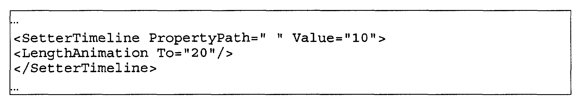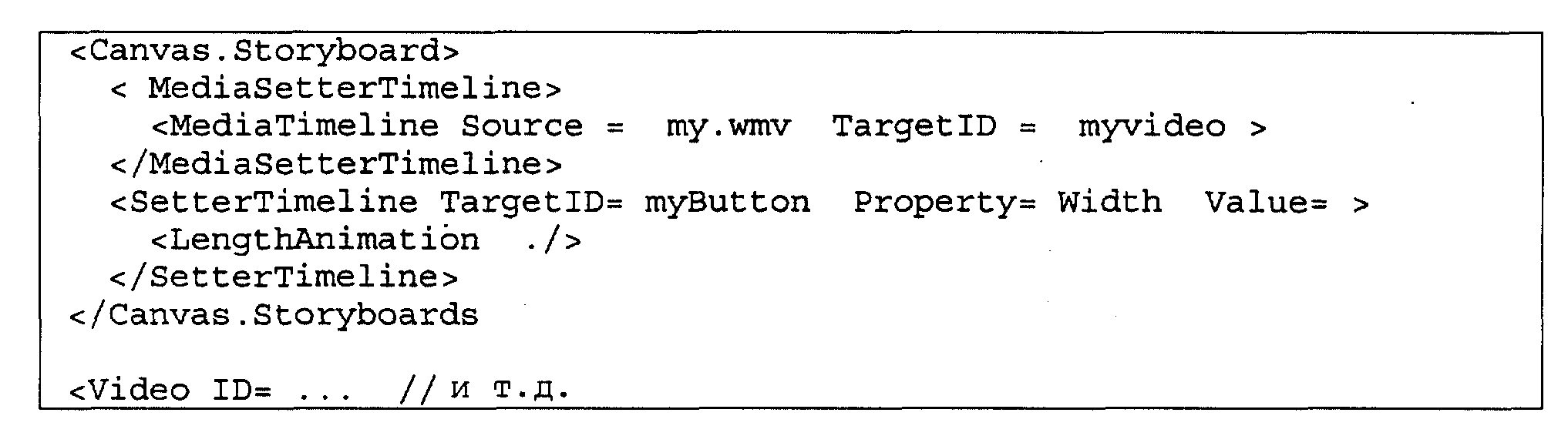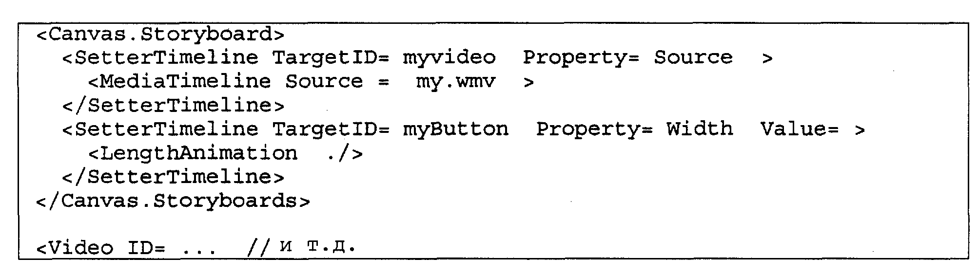 Согласно различным аспектам настоящего изобретения, в одной реализации, чтобы использовать видеоряд для анимации, автор программы добавляет Timeline, механизм ассоциации (например, SetterTimeline или присоединенное свойство Storyboard) и объекты Animation к свойству Storyboards для FrameworkElement. Видеоряды можно применять непосредственно к конкретным элементам или задавать в стилях (как описано ниже). В этой реализации, видеоряд имеет, по меньшей мере, одну SetterTimeline, которая используется для привязки одной или нескольких временных линий к указанному свойству указанного объекта. Помимо основных свойств хронирования вышеописанной временной линии, SetterTimeline имеет три уникальных свойства, которые позволяют авторам указывать объект и свойство для анимации, и базовое значение, от которого нужно анимировать, а именно TargetID, которое указывает объект, подлежащий анимации; PropertyPath (синоним слов «свойство» и «путь»), которое указывает свойство, подлежащее анимации; и Value, необязательное свойство, которое, если присутствует, указывает базовое значение для указанного свойства. Заметим, что после того как автор указал объект и свойство с помощью SetterTimeline, автор добавляет временные линии и анимации как его дочерние элементы для применения их к указанному свойству.
