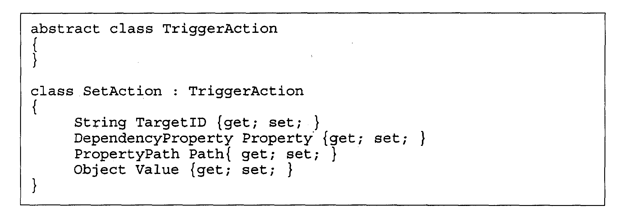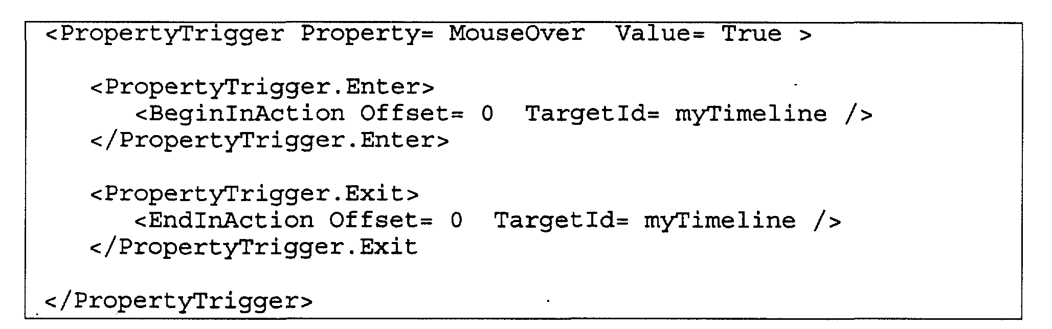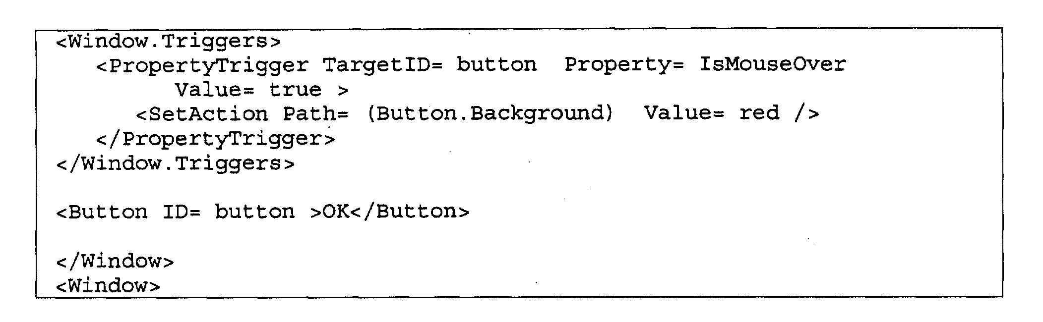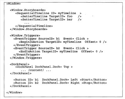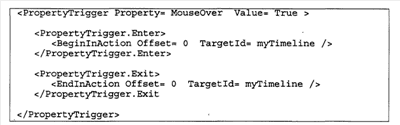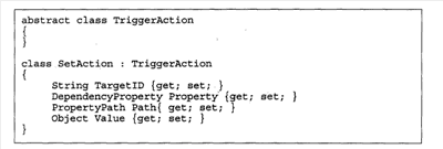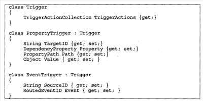 Триггеры – это свойство коллекции на FrameworkElement. Триггер может задавать действия, включающие в себя SetAction and TimelineAction. SetAction задает значение свойства. TimelineAction манипулирует временной линией в свойстве Storyboards.