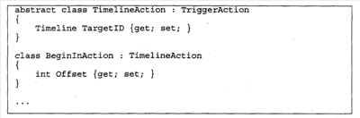 Заметим, что в вышеприведенном коде используется последовательная временная линия, а не независимые временные линии. Дочерние временные линии последовательной временной линии запускаются последовательно, например некоторый видеоряд, соответствующий “bar” (не показан), запускается по выполнении “foo”, а не в соответствии с какими-либо данными времени, заданными программой.