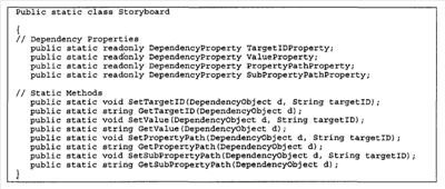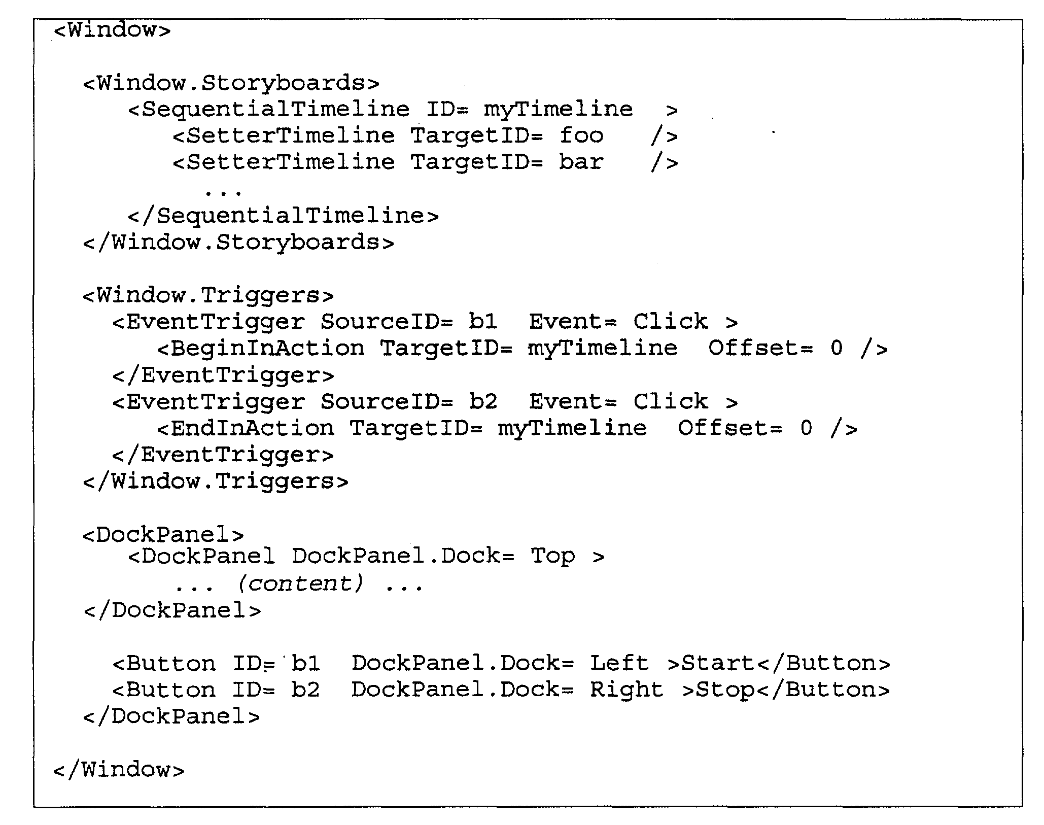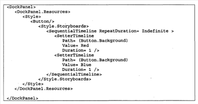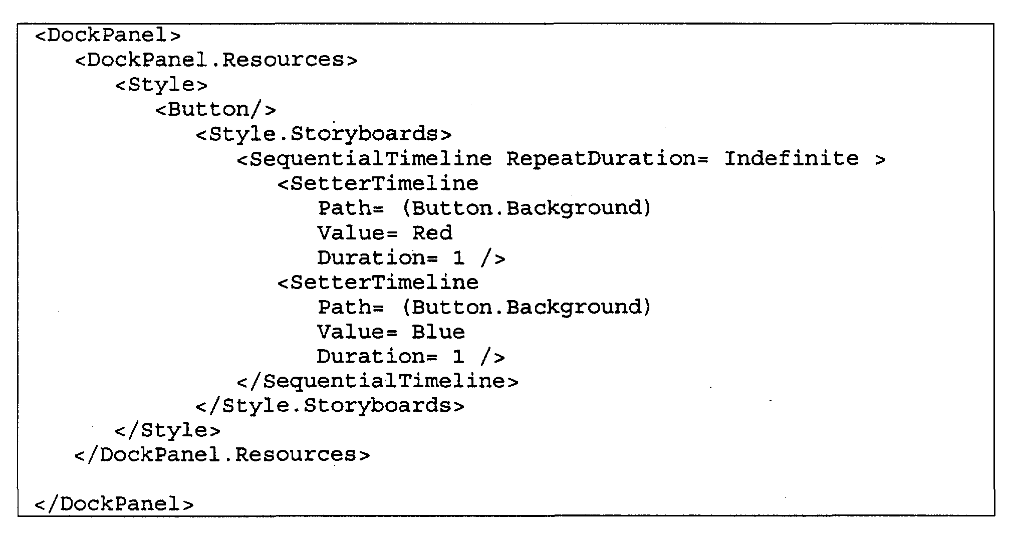 Первоначально один или несколько экземпляров Timeline добавляется к свойству Storyboards для DockPanel, например, путем вызова DockPanel. Storyboards.Add (new SetterTimeline ( )).
