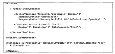 Обращаясь к объяснению путей сложного свойства, возможно, что средство задания изменяет не только свойство на пункте назначения, но, в некоторых случаях, одно из подсвойств пункта назначения. В общем случае, при обработке сложных свойств, сначала устанавливается, какое значение свойства нужно для элемента, а затем ставится точка в это свойство для анимации. Например, следующий код иллюстрирует красный прямоугольник, который повторно и постепенно проявляется и исчезает благодаря анимации непрозрачности:
