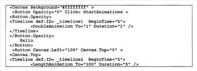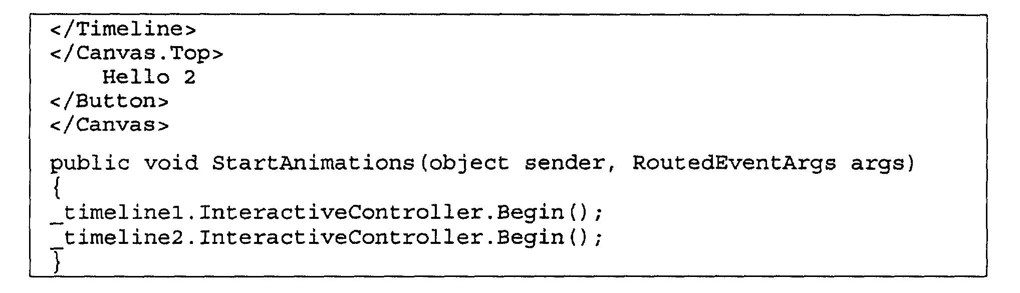 Пусть, например, следующий иллюстративный код, написан без видеоряда и, таким образом, требует дополнительный код для добавления интерактивного ответа (в этом примере желательна одновременная анимация двух отдельных кнопок после щелчка мышью). Автор кода должен быть уверен, что он задает одно и то же время начала для анимации каждой кнопки, поскольку эти времена должны быть объявлены отдельно на временной линии каждой кнопки. Заметим, что, хотя этот код предназначен для анимации двух кнопок в одно и то же время, в действительности будет некоторое отставание между анимацией первой кнопки и анимацией второй кнопки, поскольку они запускаются разными вызовами (Begin):