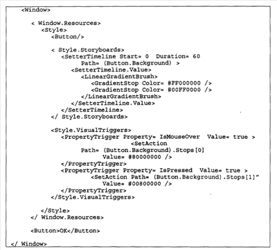 Использование путей сложного свойства требует поддержания согласованных часов при повторном построении свойства. Например, следующий код разметки показывает кнопку, которая получает фон кисти линейного градиента из видеоряда, где первая остановка изменяется одним триггером свойства (когда мышь находится на кнопке), а вторая остановка изменяется вторым триггером (при нажатии кнопки):