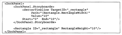 Согласно описанному выше, SetterTimeline – это временная линия для задания свойства, которое можно неявным образом нацелить на главный FrameworkElement или на целевой FrameworkElement, если указан, и, в необязательном порядке, значение. Если задан, TargetID представляет собой ссылку на ID для FrameworkElement в иерархии наследников главного FrameworkElement. Свойство Path (синоним здесь PropertyPath) для SetterTimeline описывает, какое свойство анимируется через видеоряд, и оно необходимо.