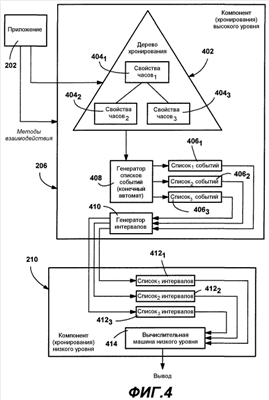 Согласно фиг.4, по меньшей мере, некоторые свойства часов могут иерархически соотноситься в дереве 402 хронирования часов. Трое таких часов со своими свойствами показаны на фиг.4, а именно свойства 4041-4043 часов, однако понятно, что в данной ситуации может существовать гораздо больше часов и альтернативных деревьев хронирования. Для каждых часов, которые, например, могут соответствовать анимированному объекту (или набору объектов, координируемых видеорядом), подлежащему отображению, компонент 206 высокого уровня включает в себя конечный автомат, именуемый генератором 408 списка событий, который генерирует список событий (например, 4061) на основании свойств часов. В общем случае, генератор 408 списка событий группирует события, которые первоначально были запланированы заданными свойствами часов совместно с любыми явными интерактивными событиями, например запросами приостановки и возобновления, которые принимаются в отношении анимации, в список событий. Часы поддерживаются для каждой анимации (или группы анимаций через видеоряд, как описано ниже), и, таким образом, имеется список событий, соответствующий каждой независимой анимации/набору анимаций, а также для каждого независимого линейного мультимедиа.