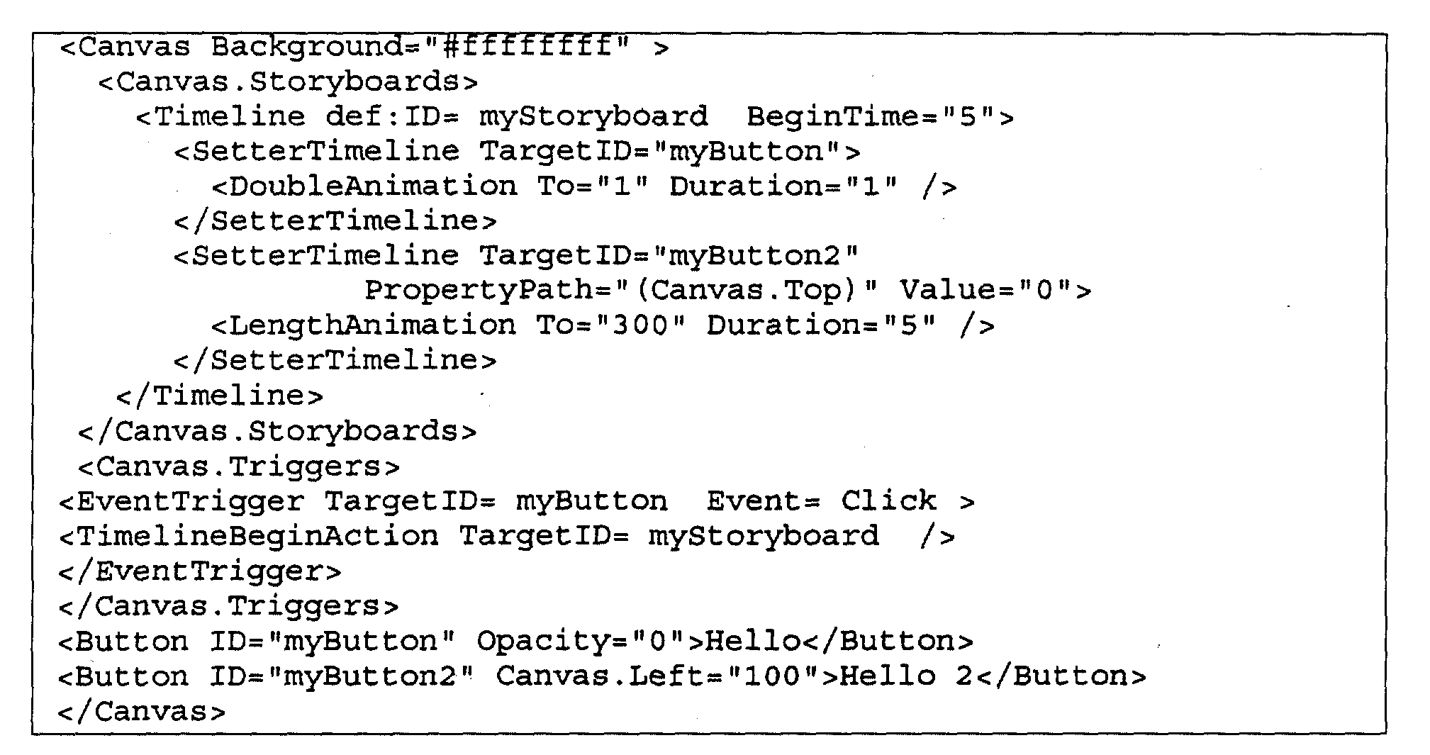 Этот второй иллюстративный код XAML альтернативно использует видеоряд для инициирования одновременных анимаций на двух кнопках по событию щелчка. Для этого в единой временной линии видеоряда холста имеется одна SetterTimeline, которая привязывает свойство одного элемента (свойство непрозрачности элемента myButton) к этой временной линии видеоряда, и другая SetterTimeline, которая привязывает свойство другого элемента (свойство местоположения элемента myButton2) к той же временной линии видеоряда. Единичное событие (щелчок по myButton) запускает видеоряд, чтобы он начал скоординированную анимацию, которая с течением времени изменяет непрозрачность myButton и положение myButton2.