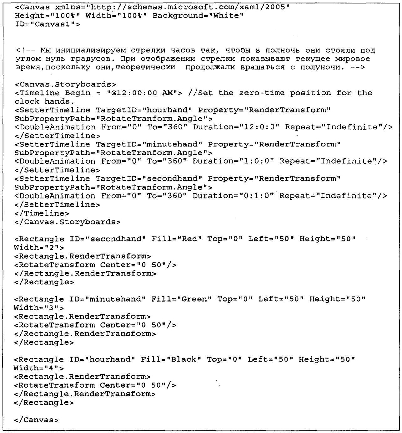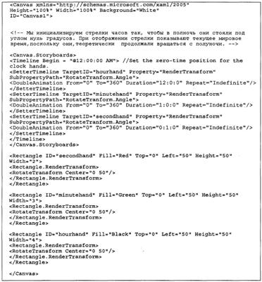 Таким образом, видеоряды позволяют автору организовать и управлять наборами анимаций как группой вместо того, чтобы задавать изменение каждой анимации с течением времени по отдельности, что позволяет напрямую создавать анимации, синхронизированные друг с другом, и последовательности анимаций (описано ниже). Рассмотрим следующий пример, который соответствует часам с тремя прямоугольными стрелками, отличающимися шириной и цветом: черной часовой стрелкой, зеленой минутной стрелкой и красной секундной стрелкой, которые автоматически отображают текущее системное время путем использования преобразования поворота, которое задает угол. В этом примере используется единая временная линия видеоряда для координации анимации трех стрелок: