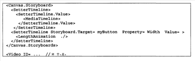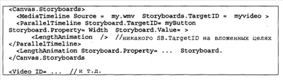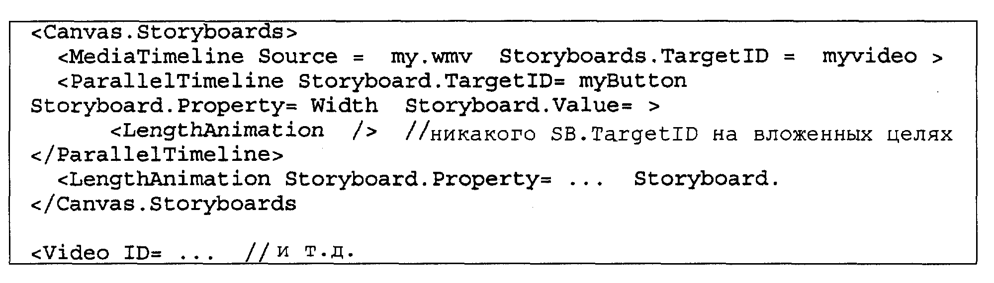 Заметим, что в вышеприведенном примере имеется MediaTimeline для ассоциирования некоего мультимедийного файла (my.wmv) с видеорядом и ParallelTimeline, в которой заданы свойства видеоряда (для простоты показанные с некоторыми пропусками). Заметим, что “ParallelTimeline” является, по существу, временной линией видеоряда, рассмотренной выше, с измененным именем, чтобы ее можно было отличить от других типов временных линий, включая MediaTimeline (выше) и SequentialTimeline (описана ниже). Однако ParallelTimeline также исключает необходимость в SetterTimeline благодаря использованию свойств для видеоряда, например Storyboard.Property, Storyboard.Value и Storyboard.Target (вместо TargetID, PropertyPath и Value для SetterTimeline), хотя она имеет тенденцию делать присоединенные свойства длинными и не очень заметными. В общем случае, свойства видеоряда можно присоединять к любой временной линии, пока для каждого видеоряда имеется некоторое свойство пункта назначения (например, TargetID), другие свойства видеоряда находятся на той же временной линии, что и TargetID, и нет вложенных Target. Заметим, что, если ни одного TargetID не задано, предполагается, что пунктом назначения является элемент, владеющий видеорядами, например Canvas в предыдущем примере. Для мультимедиа MediaTimeline не задают Storyboard.Property или Storyboard.Value.