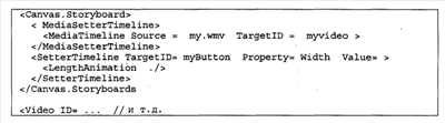 Следующий иллюстративный код показывает, как видеоряды упрощают кодирование и повышают функциональность по сравнению с предыдущим иллюстративным кодом (заметим, что в этом примере используется иллюстративная реализация SetterTimeline вместо альтернативной реализации, которая действует через присоединенные свойства на классе Storyboard, который описан ниже):