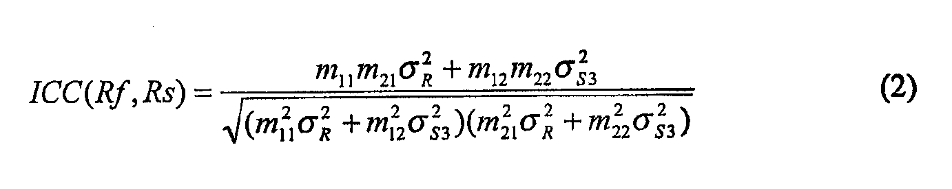 где матрица M имеет коэффициенты m11 … m22, и где H3(G3·S) = S3 является выходным сигналом блока 33 декорреляции. Нормированный коэффициент ICC декорреляции сигналов Rf и Rs задан посредством:
