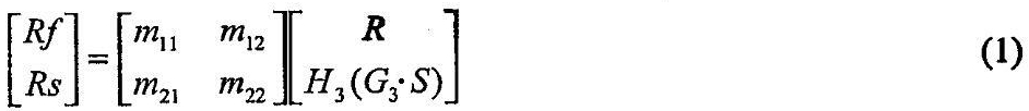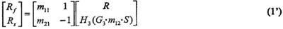 Обнаружено, что дополнительная константа m12 = -m22 является эффективной. Другими словами, мощность промежуточного сигнала (вспомогательного канала) S3 в обоих сигналах Rf и Rs является равной, но имеет противоположные знаки (противофаза). Если m12 = -m22 имеет силу, коэффициенты m11 и m22 могут быть перемещены выше блока 33 декорреляции, например к блоку 23 усиления, для того чтобы сделать возможным обработку перед декорреляцией. Уравнение (1) может быть затем переписано как: