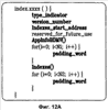 На фиг.12A приведен синтаксис, связанный с заголовочной частью индексного файла (index.bdmv). Например, в поле “type_indicator” записывается определенная информация, способная идентифицировать индексный файл, например, код символа “INDX”. В поле “version_number” записывается информация, относящаяся к информации о версии индексного файла. В поле “Indexes_start_address” записывается информация о местоположении, относящаяся к начальному положению файла поля “Indexes()”. Индексный файл (index.bdmv) включает в себя поле “ApplnfoBDMV()” для предоставления общей информации, относящейся к автору диска; и поле “Indexes()” для индексации содержимого, записанного на диске, и предоставления пользователю индексированного содержимого. Описание поля “Indexes()”, относящегося к настоящему изобретению, дано ниже.