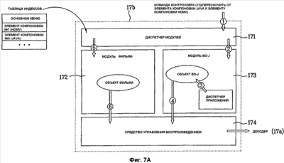 В связи со вторыми характеристиками вышеуказанной модели плеера, приведенной на фиг.5B, диспетчер 171 модулей включает в себя диспетчер 171a событий пользователя для приема команды пользователя. После приема команды пользователя диспетчер 171a событий пользователя определяет, является ли принятая команда пользователя командой пользователя, введенной действием пользователя (ДП). Если установлено, что команда пользователя является командой пользователя, введенной действием пользователя (ДП) для элемента компоновки HDMV, диспетчер 171a событий пользователя передает команду пользователя контроллеру 172b ДП, содержащемуся в модуле 172 фильма, так что контроллер 172b ДП выполняет команду пользователя. Если же установлено, что принятая команда является командой пользователя, введенной ключевым случаем для элемента компоновки Java, диспетчер 171a событий пользователя передает принятую команду пользователя виртуальной машине 173b Java, содержащейся в модуле 173 BDJ, так что виртуальная машина 173b Java выполняет команду пользователя.