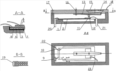 Конструкция биморфного пьезоэлемента приведена в сечениях А-А и Б-Б на чертеже. Он состоит из двух слоев пьезоэлектрика 3, 4, покрытых слоями металла 5, 6, 7, образующими электроды. Верхний 5 и нижний 6 слои электрически соединены припаянной токопроводящей перемычкой 19 (сечение Б-Б).