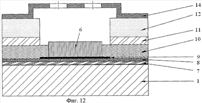 фиг.5 – формирование многослойной структуры, состоящей из подложки (1), токоведущего слоя (7), адгезионного слоя (8), каталитического слоя (9), первого изолирующего слоя (10), электропроводящего слоя (11), второго изолирующего слоя (12);