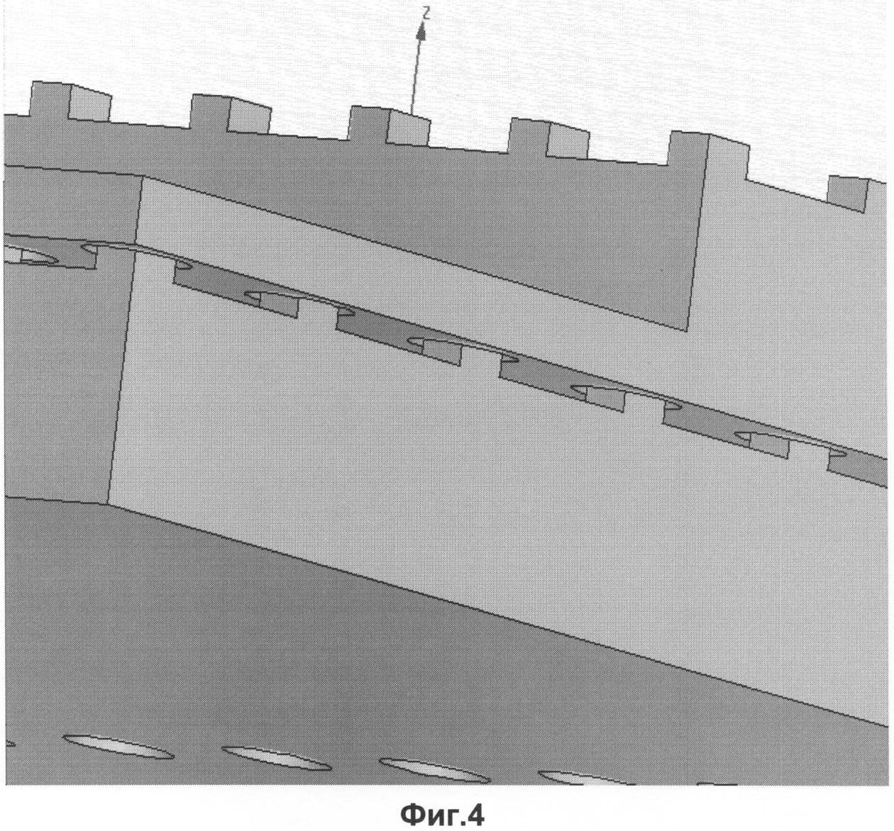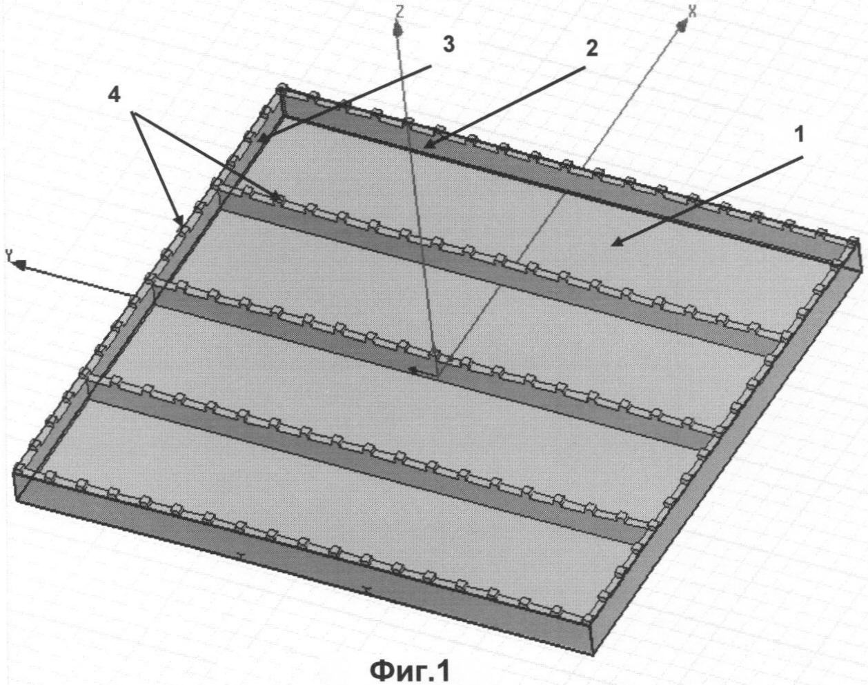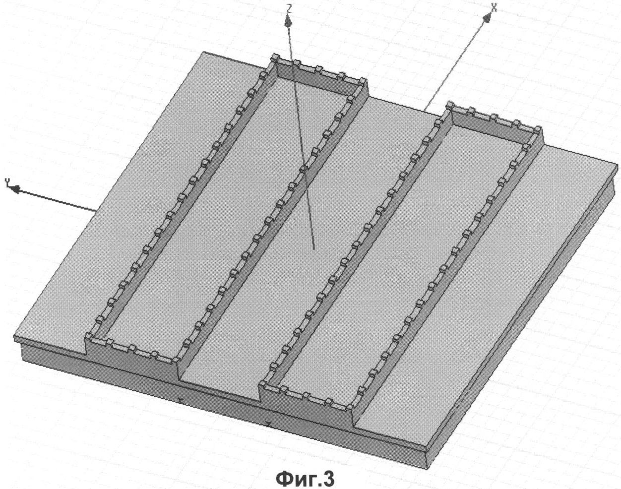 На Фиг.1 изображена тыльная сторона одного из волноводных корпусов ВЩАР, где 1 – волноводный канал, расположенный на тыльной стороне волноводного корпуса; 2 – боковая стенка волноводного канала; 3 – торцевая стенка волноводного канала; 4 – штыри на боковой и торцевой стенках волноводного канала.