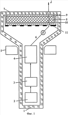 Еще одним возможным вариантом исполнения лазерного экрана предлагаемого прибора может быть создание в объеме полупроводникового материала областей, которые поглощают фотоны с частотой, лежащей в полосе лазерной генерации прибора, например областей в виде параллельных полос с легированием полупроводника, приводящим к безизлучательной рекомбинации носителей и поглощению света, или же удалением в пределах полос части полупроводникового материала с заполнением образовавшихся щелей безизлучательно поглощающим электроны материалом, например диффузионно-твердеющим металлическим припоем Ga-In-Cu или Ga-In-Ag. Более детально второй вариант исполнения лазерного экрана предлагаемого прибора поясняется на фиг.2. Лазерный экран в этом исполнении состоит из полупроводниковой пластины 8 с отражающими покрытиями 9, 10 и поглощающими областями 11.