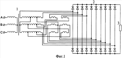 Задача изобретения – создание преобразователя переменного тока в постоянный с 16-кратной частотой пульсации, имеющего более высокий КПД и менее сложного в изготовлении.