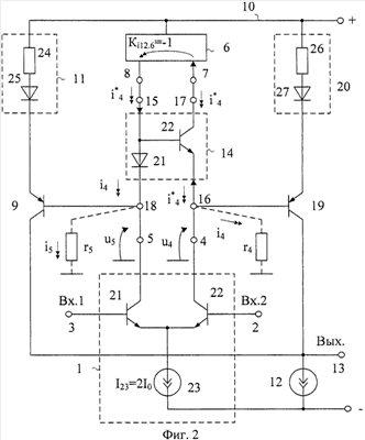 Кроме этого, на фиг.2 в соответствии с п.2 формулы изобретения к первому токовому выходу 4 входного параллельно-балансного каскада подключен второй выходной инвертирующий каскад по схеме с общим эмиттером на втором транзисторе 19, эмиттер которого связан с шиной источника питания 10 через второй двухполюсник 20.