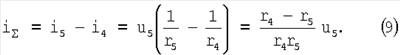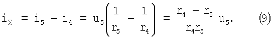 Если условие (7) выполняется, при изменении напряжения в узле (5) на величину u5 через r5 появится паразитный переменный ток i5=u5/r5. Однако в заявляемой схеме напряжение u5 передается и в узел 4 (u4=u5), что вызывает такое же изменение тока через r4: