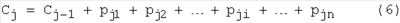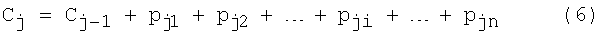 Сформируем исходное состояние первого 3 и второго 6 счетчиков соответственно в виде R10 и R20, где R10 и R20 – число, записываемое в счетчики в начальный момент времени. Пусть R10=R20=0. В дальнейшем число в первом счетчике 3 будем обозначать R1x (цифровой сигнал, обозначим С), а число во втором счетчике 6 будем обозначать R2x. Первый счетчик 3 осуществляет преобразование сосчитанного числа импульсов в цифровой сигнал С. Цифровой сигнал С будем формировать путем последовательного суммирования pji импульсов тех последовательностей, которые определяют время Tj, причем в интервале времени Tj последовательно будем суммировать вначале pj1 импульсов с максимальным периодом следования 1, затем pj2 импульсов с меньшим периодом следования 2 и в конце pjn импульсов с наименьшим периодом следования n. При формировании последующей метки времени к образованному цифровому сигналу С, соответствующему предыдущей метке, будем аналогично прибавлять числа импульсов pji, которые определяют текущий интервал времени. Иначе говоря, каждую последующую метку времени Mj будем формировать в моменты времени, когда цифровой сигнал равен сумме значений цифрового сигнала, соответствующего предыдущей метке времени, и чисел pji, определяющих текущий интервал времени, т.е.