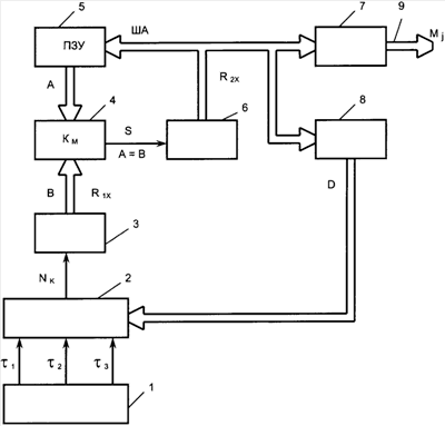 Пусть при R2x=2 ПЗУ подключает к выходу ячейку с адресом 2, содержимое которой А=р11+p12+P13=2+8+12=22, а второй дешифратор 8 формирует на своем выходе D такой код, который устанавливает мультиплексор 2 в состояние, при котором на его выход Nk подключается последовательность импульсов 3. В этом случае при R1x=С=р11+p12+p13=22 на шине В цифрового компаратора 4 формируется сигнал В=22, а на выходе А=В цифрового компаратора 4 вырабатывается сигнал S=1 и во втором счетчике 6 устанавливается число R2x=3. Так как цифровой сигнал С=C1=р11+p12+p13, то в этом случае согласно (6) на выходе первого дешифратора 7 формируется метка времени M1. Далее ПЗУ подключает к выходу ячейку с адресом 3, содержимое которой А=р11+p12+p13+р21=22+2=24, а второй дешифратор 8 формирует на своем выходе D такой код, который устанавливает мультиплексор 2 в состояние, при котором на его выход Nk подключается последовательность импульсов 1. Далее процесс формирования меток времени М2, М3, M4 и M5 аналогичен описанному выше процессу. При С=С2=C1+р21+р22+p23, согласно (6), формируется метка времени М2. При С=С3=С2+p31+p32+p33, согласно (6), формируется метка времени М3 и так далее.