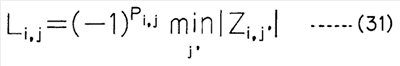 В вышеприведенном равенстве j является целым числом от 0 до N-1, i обозначает целое число от 0 до M-1, Fj обозначает соответствующие принятые данные, а i’ является целым числом от 0 до M-1, не совпадающим с i, и покрывает все целые числа, элементы которых в вектор-строке проверочной матрицы, соответствующей j, являются 1. Процессор 83 узла проверки обновляет сообщение проверки для переменной из сообщения переменной для проверки. Детали обработки узла проверки представлены следующим равенством (31):
