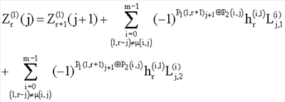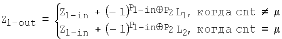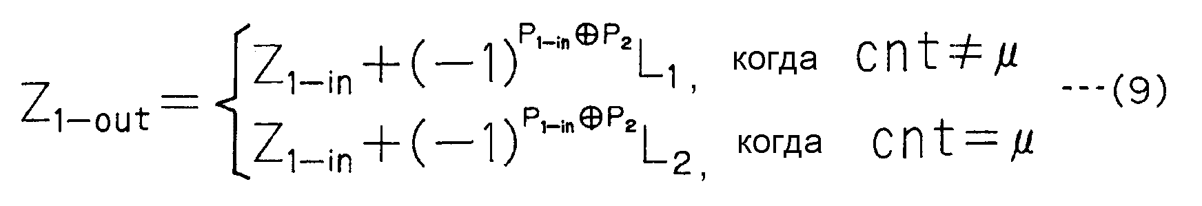 Z эквивалентен Zj-1 (i) по равенству 20, тогда как cnt указывает набор целого числа от 0 до n-1 и целого числа от 0 и a-1, соответствующий значению счета, синхронизированному с тактовыми импульсами. Блок 62 узлов обработки проверки для переменной выводит для выходных данных L1-in, L2-in, P2-in и in, L1-out, L2-out, P2-out и out, представленных следующими равенствами (22), (23), (24) и (25) соответственно: