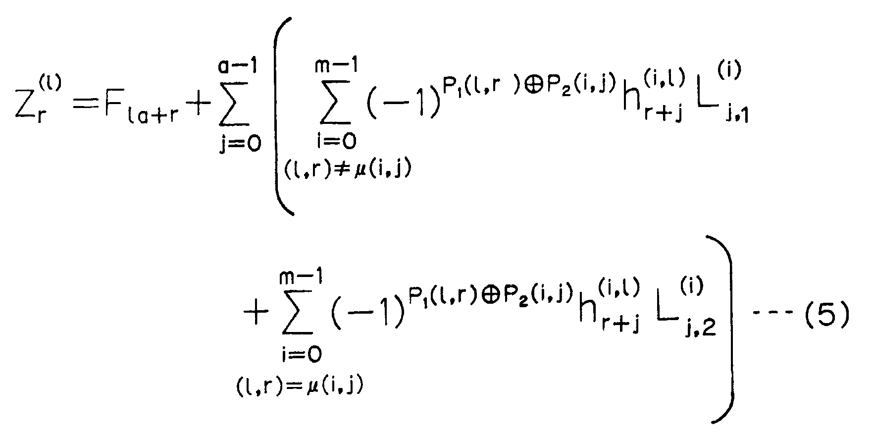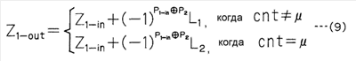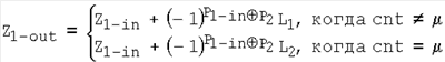 которое дает данные сообщения в момент (а-j) времени, если начальное состояние (значение в момент (0) времени) данных сообщения, сохраненных в r-м регистре, представлено в качестве , а cnt обозначает набор целых чисел 1 между 0 и n-1, предопределенных из одного блока регистров переменной для проверки в другой, и набор целых чисел между 0 и а-1, соответствующих значению счетчика, синхронизированного с тактовым сигналом; упомянутое средство обработки переменной для проверки включает в себя: компаратор, который принимает cnt и µ; селектор, который принимает L1 и L2 в качестве входных данных и выводит одно из L1 и L2 с выходными данными упомянутого компаратора в качестве управляющего сигнала выбора; схему исключающего ИЛИ, которая принимает Р2 и P1-in; инвертор плюса и минуса, который принимает выходные данные упомянутого селектора и инвертирует полярность выходных данных упомянутого селектора на основании выходных данных упомянутой схемы, исключающего ИЛИ; и сумматор, который суммирует Zin и выходные данные инвертора плюса и минуса, и выводит результат суммирования в качестве Z1-out; упомянутое средство обработки переменной для проверки выводит для входных данных Zin и P1-in, Z1-out и P1-out, представленные следующими равенствами: