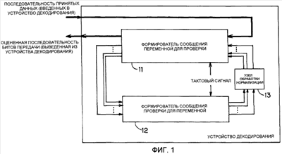 Последовательность принятых данных подается в формирователь 11 сообщения переменной для проверки из сети связи, к которой присоединено устройство декодирования. Поскольку, вообще, бывают ошибки в принятых данных, например, вследствие шума, устройство декодирования оценивает последовательность переданных битов и выводит оцененную последовательность переданных битов.