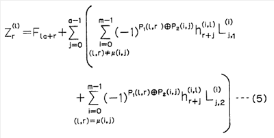 1. Устройство декодирования, которое декодирует псевдоциклические коды с контролем четности низкой плотности при кодировании с исправлением ошибок и выводит оцененную последовательность битов передачи, которая является результатом декодирования, упомянутое устройство содержит: средство формирования сообщения переменной для проверки, включающее в себя множество регистров сдвига с обратными связями предопределенного количества ступеней, включающих в себя множество регистров; упомянутое средство формирования сообщения переменной для проверки принимает последовательность принятых данных, формирует и выводит сообщение переменной для проверки и оцененную последовательность битов передачи; упомянутое сообщение переменной для проверки содержит данные, заключающие в себе сумму коэффициента логарифмического правдоподобия и априорного значения; средство формирования сообщения проверки для переменной, включающее в себя множество регистров сдвига с обратными связями заданного количества ступеней, включающих в себя множество регистров; упомянутое средство формирования сообщения проверки для переменной выводит, по приему сообщения переменной для проверки, выведенного из упомянутого средства формирования сообщения переменной для проверки, сообщение проверки для переменной, включающее в себя данные, сформированные в ответ на упомянутое принятое сообщение переменной для проверки; и средство обработки нормализации, которое перемножает заданные данные, включенные в упомянутое сообщение проверки для переменной, выведенное упомянутым средством формирования сообщения проверки для переменной, с заданной константой и выводит результирующее произведение в упомянутое средство формирования сообщения переменной для проверки; при этом упомянутое средство формирования сообщения переменной для проверки включает в себя средство обработки переменной для проверки, которое суммирует данные, соответствующие выходу упомянутого средства формирования сообщения проверки для переменной, с заданными данными из числа данных, удерживаемых в регистрах из числа упомянутых регистров сдвига с обратными связями, включенных в упомянутое средство формирования сообщения переменной для проверки, сохраняет результирующую сумму в регистре следующей ступени и выводит при заданной временной привязке оцененную последовательность битов передачи и сообщение переменной для проверки, включающее в себя данные, удерживаемые в упомянутом регистре; и при этом упомянутое средство формирования сообщения проверки для переменной включает в себя средство обработки проверки для переменной, которое выбирает два элемента данных из данных, удерживаемых упомянутыми регистрами из числа упомянутых регистров сдвига с обратными связями упомянутого средства формирования сообщения проверки для переменной, а также данные наименьшего значения и данные второго наименьшего значения из данных, выведенных упомянутым средством обработки переменной для проверки, сохраняет данные, выбранные в регистре следующей ступени, и выводит данные, удерживаемые в упомянутом регистре, при заданной временной привязке в качестве сообщения проверки для переменной; упомянутое средство формирования сообщения переменной для проверки является скомпонованным меж