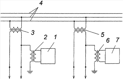 Устройство работает следующим образом. Сигнал с выхода блока передачи информации 1 посредством первого дополнительного трансформатора 2 через емкость между первичной и вторичной обмотками трансформатора 3 возбуждает высокочастотные электрические колебания в линии электропередачи 4, которые распространяются вдоль нее. За счет этого через емкость между первичной и вторичной обмотками второго трансформатора напряжения 5 и через второй дополнительный трансформатор 6 на входе блока приема возбуждается сигнал, закон изменения которого повторяет закон изменения сигнала на выходе блока передатчика сигналов информации 1. Далее этот сигнал обрабатывается в блоке приемнике сигналов информации 7.