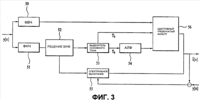 Устройство дополнительно включает в себя адаптивный гребенчатый фильтр 56 для обработки высокочастотной компоненты. Устройство также включает в себя блок 52 принятия решения речевой/неречевой (Р/НР), выделитель 53 основного тона и блок 55 спектрального вычитания для обработки низкочастотной компоненты. Кроме того, устройство включает в себя блок 54 адаптивного линейного фильтра (АЛФ). В качестве альтернативы, блок 54 АЛФ может быть заменен средством для выполнения другой схемы улучшения качества речи.