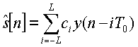 Когда речевой сигнал с шумами представлен посредством y[n], речь представлена посредством s[n], а речь, из которой удален шум, оценивают как представляемую посредством речь, улучшенную адаптивным гребенчатым фильтром, представляют формулой 5.