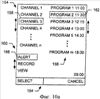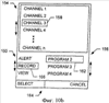 Если пользователь выбирает и терминал принимает выбор – создать предупреждение или записать контент для канала, пользователь может просмотреть текущий и/или запланированный контент или программы для выбранного канала 158 в части окна 156 списка каналов с помощью клавиш направления (например, ( )) для выбора программы. При этом контент или программы могут быть представлены в окне списка выбора программ несколькими различными способами, такими как по имени и времени (см. фиг.10а), типу контента или программы (см. фиг.5, 10b, например, «хоккей», «новости», «сериал») или подобно этому. Безотносительно к тому, как представлены контент и программы, пользователь терминала может затем выбрать и терминал может принять выбор, программу из окна списка программ, как показано в блоке 150 для записи выбранной программы 162 и в блоке 154 для создания предупреждения касательно выбранной программы.