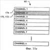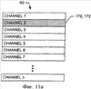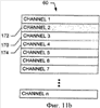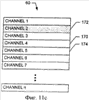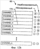 Чтобы далее показать преимущества от осуществления настоящего изобретения, рассмотрим пример списка каналов 60 (CHANNEL 1-n) на фиг.11а-11f. При этом, как показано на фиг.11а, клиентское приложение 94 принимает и использует (например, воспроизводит) контент для канала 2, где канал 2 – выбранный канал 170. В то время как клиентское приложение принимает и использует контент для канала 2 (т.е. канала х), пользователь терминала устанавливает канал 2 в режим записи, так что клиентское приложение записывает и запоминает контент канала 2, где канал 2 теперь – канал 172 в режиме записи. Пользователь терминала решает затем переключать каналы в списке каналов, чтобы посмотреть, какой контент доступен по другим каналам. Таким образом, пользователь изменяет канал вниз (+) от канала 2 на соседний канал 3 (т.е. канал х+1) нажатием кнопки направления терминала 10. Клиентское приложение продолжает принимать и записывать контент канала 2, при этом изменение канала заставляет клиентское приложение инициировать тайм-аут записи канала 2. Канал 3 затем становится выбранным каналом 170, а канал 2 становится ранее выбранным каналом.