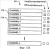 В то время, когда клиентское приложение принимает/использует контент для канала 2 (т.е. канала х), пользователь терминала может решить переключать каналы в списке каналов, чтобы посмотреть, какой контент доступен на других каналах. Так, пользователь меняет канал вниз (+) от канала 2 к следующему соседнему каналу 3 (т.е. каналу х+1) нажатием кнопки направления терминала 10. Канал 3 затем становится выбранным каналом 170, а канал 2 становится ранее выбранным каналом. В ответ на смену пользователем терминала канала на канал 3 клиентское приложение 94 настраивает канал 3 и принимает шифрованный контент для этого канала. С целью пояснения, пусть канал 3 – неабонированный канал для пользователя терминала. Хотя клиентское приложение принимает контент для канала 3, DRM модуль терминала не может дешифровать контент канала 3. Таким образом, вместо использования контента для канала 3 клиентское приложение получает от DRM модуля (или модуля дешифрации) индикацию, что канал 3 не абонирован (т.е. DRM модуль терминала не может дешифровать ключ, или модуль дешифрации не может дешифровать контент для канала 3). Клиентское приложение может затем использовать индикацию и/или другой контент, показывающий, что канал не абонирован (например, пустой экран, приглашение для подписки и т.д.), выдавая индикацию и/или другой контент через пользовательский интерфейс терминала (например, дисплей 34, дисплей 82 и т.п.). Как и при первом случае выбора канала 2, клиентское приложение может пометить канал 3 как неабонированный канал.