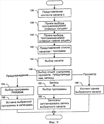 После показа всплывающего окна дисплея пользователь может передвигаться по частям окна 154, 156, 160, 164 для выбора канала, программы и/или опции. Более конкретно, обращаясь снова к фиг.9, пользователь терминала может просматривать каналы в части 154 окна списка каналов с использованием клавиш направления (обычных и/или программируемых кнопок) (например, кнопок клавиатуры ( ) для выбора канала. Пользователь терминала может затем выбрать и терминал 10 может принять такой выбор, канал из окна списка каналов, как показано в блоке 144. Пользователь может затем выбрать среди возможных опций для канала 158 опцию для просмотра контента выбранного канала (например, «просмотр»), создать предупреждение для программного контента, запланированного для выбранного канала (например, «предупреждение»), или записать текущий или запланированный контент для выбранного канала (например, «запись»). Если пользователь выбирает и терминал принимает выбор просмотра контента выбранного канала, терминал может представить контент для выбранного канала, например, принимаемый и используемый контент для выбранного канала.