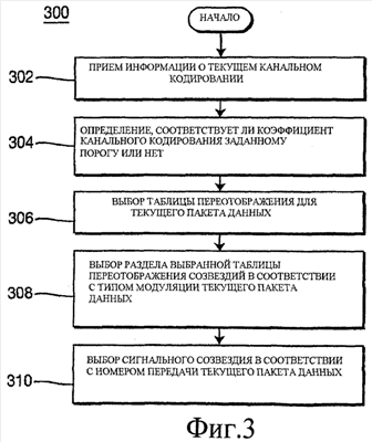 На этапе 306 процессор 104, 144 осуществляет выбор таблицы переотображения для текущего пакета данных. Передача каждого пакета данных может выполняться многократно, и при каждой передаче используется одна и та же таблица переотображения. Однако для каждой передачи может потребоваться другое созвездие.