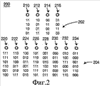 На фиг. 2 представлена типичная таблица 200 посимвольного переотображения созвездий, которая содержит раздел 202, используемый для модуляции QAM-16, и раздел 204, используемый для модуляции QAM-64. Фиг. 2 демонстрирует правила отображения только для битов с обозначением I, реализуемые системой 100, представленной на фиг. 1. Однако такое же отображение применяется и к битам с обозначением Q. Как раздел 202 для модуляции QAM-16, так и раздел 204 для модуляции QAM-64 содержат многочисленные созвездия, где каждое созвездие соответствует конкретной передаче. На фиг. 2 каждый ряд представляет собой созвездие, причем первый ряд соответствует первой передаче, второй ряд соответствует второй передаче и т.д.