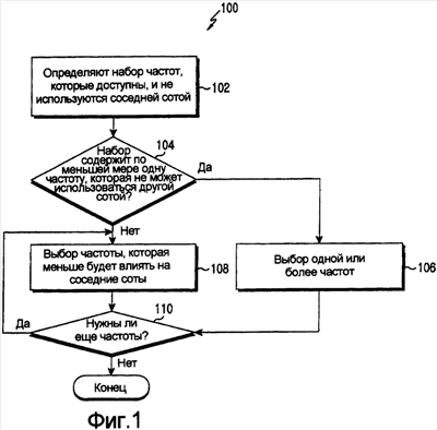 На этапе 102 точка доступа (например, базовая станция) или другое средство обработки, связанное с сотой, определяет набор частот, которые доступны для использования этой сотой и не используются соседней сотой. В настоящем примере частота может определяться как доступная, если она принимается этой сотой и сота создается для использования такой частоты, и может включать в себя одну или более резервные полосы частот. На этапе 104 может выполняться определение: содержит ли набор частот по меньшей мере одну частоту, которая не может использоваться соседними сотами. Если существует частота, которая не может использоваться соседними сотами, способ 100 продолжает этап 106, на котором выбирается частота для использования сотой. Если соте требуются несколько частот и существует несколько доступных частот, как определено на этапе 104, сота может выбрать достаточно частот для удовлетворения своих частотных потребностей.