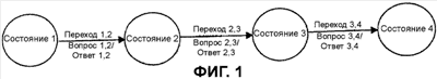 Каждый сеанс общения, который обрабатывается системой (или построением базы знаний до времени выполнения, или обработкой сообщений реального времени во время выполнения), моделируется как упорядоченный набор состояний и переходов к другим состояниям, при этом переход от каждого состояния включает в себя вопрос или утверждение клиентом и ответ агента-человека (или в некоторых случаях действие, которое должно быть предпринято в ответ на этот вопрос, такое как постановка вопроса обратно пользователю). Символическая последовательность состояние – переход – состояние для сеанса общения, который обрабатывается из записанного взаимодействия, проиллюстрирована на Фиг.1. В некоторых вариантах осуществления разделитель для каждого утверждения или сообщения от клиента или ответа агента-человека является периодом тишины или произнесенным прерыванием.