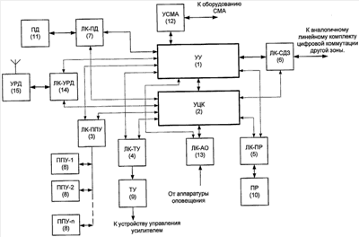 Для оповещения и переговоров в отдельных зонах станции предусмотрено использование оборудования радиодоступа 15, подключенного к устройству 2 цифровой коммутации и устройству 1 управления через линейный комплект 14.