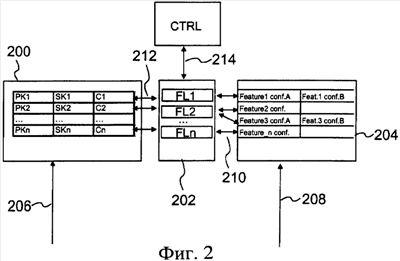 Устройство 204 для хранения конфигурации содержит одну или более конфигурационных установок для конкретной функции, в результате чего одну из возможных конфигурационных установок можно выбрать в качестве фактической установки, если это разрешено соответствующим блокиратором функциональной установки. В примере на фиг.2 устройство 204 для хранения конфигурации содержит для Feature1 две конфигурационные установки, то есть Feature1. conf.A и Feature1 conf.B, и две конфигурационные установки для Feature3, то есть Feature3. conf.A и Feature3 conf.B. Однако должно быть понятно, что при практической реализации устройство 204 для хранения конфигурации предпочтительно не является отдельным компонентом памяти, как показано на фиг.2, но представляет собой своего рода список ячеек памяти, в которых конфигурационные данные хранятся для последующей обработки. Нет необходимости хранить конфигурационные установки в каком-либо особенном порядке, как показано на фиг.2, поскольку каждая конфигурационная установка может быть взята из собственной ячейки памяти.