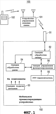 Фиг. 1 также иллюстрирует один конфигурационный пример мобильного приемопередающего устройства 102. Мобильное приемопередающее устройство содержит антенну 51, секцию 52 обработки связи, секцию 53 подачи питания, секцию 54 обработки речи, РТТ-переключатель 55 и секцию 56 управления функционированием.